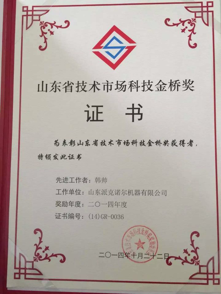 山東派克諾爾機器有限公司派克門窗幕墻研究中心主任韓帥,目前榮獲山東省技術市場科技金橋獎。這是派克機器科技人員參加山東?。▏鴥仁状闻e辦)門窗設備技術市場發明創評選活動中獲得的“諾貝爾”獎。