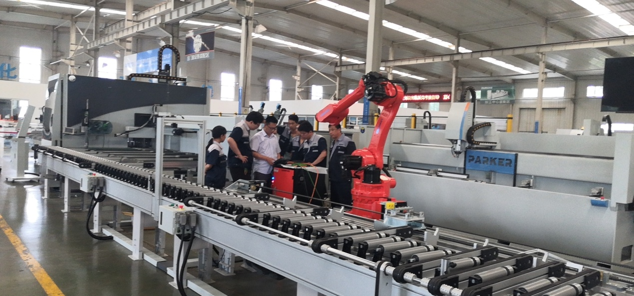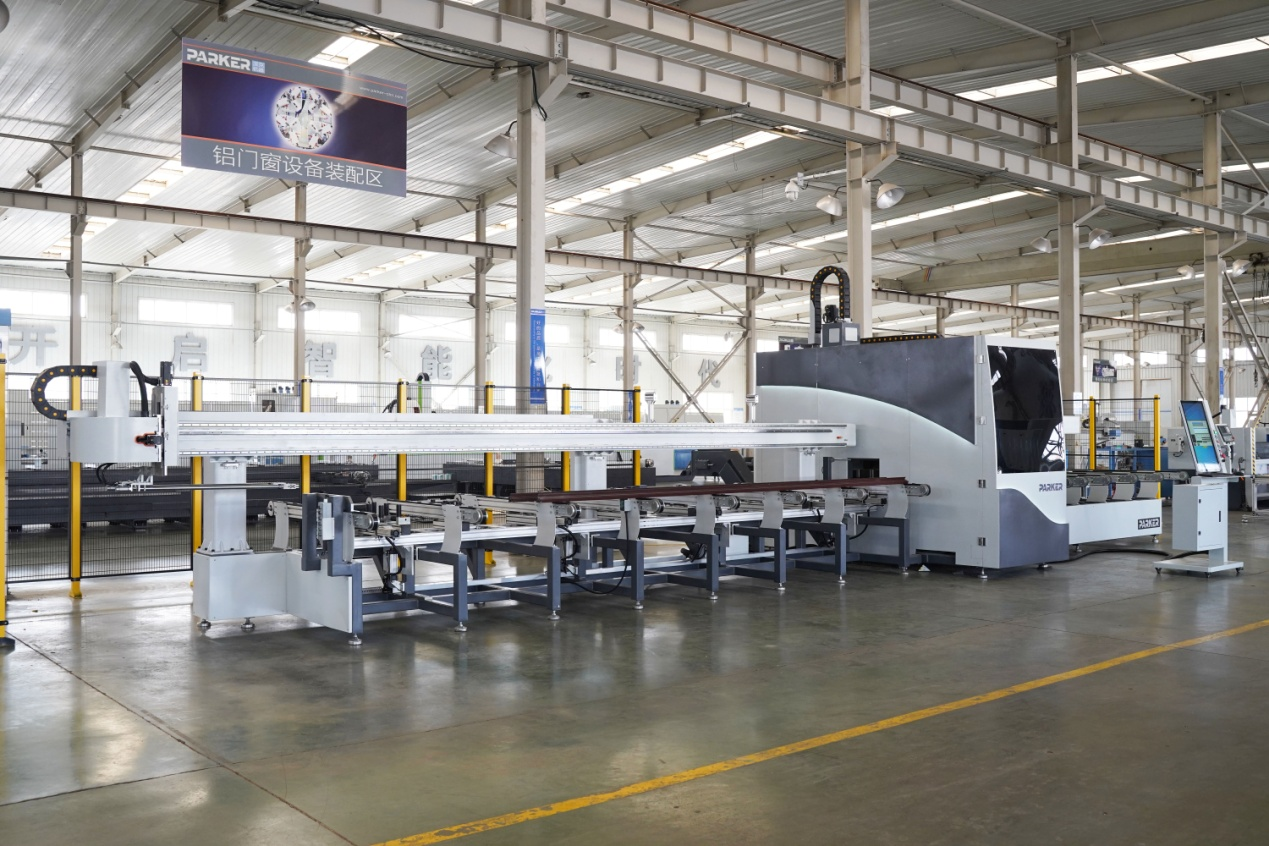 也成功做出了當前大熱的無人化鋁門窗生產線。從型材切割到成品輸出,完全節省了勞動力,中間通過機械手,也就是專門負責上下料的機器人進行設備之間型材的運輸和放置。