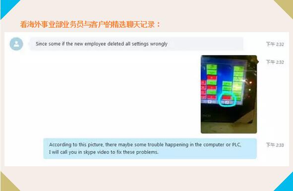 印度客戶,于2013年從派克購(gòu)買數(shù)控清角機(jī)。近日,由于新員工誤操作,導(dǎo)致設(shè)備運(yùn)行出現(xiàn)問題。客戶從印度那邊發(fā)過來求助信息,海外事業(yè)部的業(yè)務(wù)員通過Skype與該客戶取得聯(lián)系,進(jìn)一步了解設(shè)備故障出現(xiàn)的原因,故障出現(xiàn)時(shí)呈現(xiàn)的狀態(tài)等,再與技術(shù)工程師溝通交流,了解可能導(dǎo)致的原因以及用對(duì)措施,通過圖片、視頻,在線視頻等途徑進(jìn)行跨國(guó)通話,最終發(fā)現(xiàn)問題出現(xiàn)在數(shù)控系統(tǒng)之中。于是,技術(shù)部和售后服務(wù)部齊心協(xié)力將解決方案以圖片以及視頻的方式多元素,多途徑展示給客戶,指導(dǎo)客戶如何編程,并編寫一套代碼數(shù)據(jù)發(fā)送過去,最終該清角機(jī)一切數(shù)據(jù)恢復(fù)正常,六把刀又重新正常流利工作(客戶與海外事業(yè)部業(yè)務(wù)員部分聊天記錄)