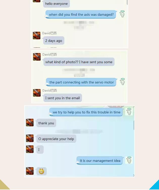 巴西客戶,購(gòu)買四軸高速鋁型材加工中心 DMCC82,使用過程中設(shè)備狀態(tài)一直很好,但是由于新員工錯(cuò)誤操作導(dǎo)致某零配件出現(xiàn)問題。派克機(jī)器海外事業(yè)部周秋杉在收到反饋之后,立即與工廠技術(shù)工程師做溝通交流,考慮到從中國(guó)到巴西長(zhǎng)途運(yùn)輸以及報(bào)關(guān)等問題會(huì)花費(fèi)很長(zhǎng)時(shí)間,最終建議其在巴西當(dāng)?shù)厥袌?chǎng)購(gòu)買零配件安裝,省時(shí)省力。雖然設(shè)備過了保修期,但派克仍然耐心指引,通過郵件往來,QQ在線視頻,WhatsApp在線聊天,在派克工匠精神的指引下,各部門齊心協(xié)力,在短的時(shí)間內(nèi)以高的效率幫助客戶解決問題,保證其工程項(xiàng)目按時(shí)完成,客戶也是心存感激,再三言謝。